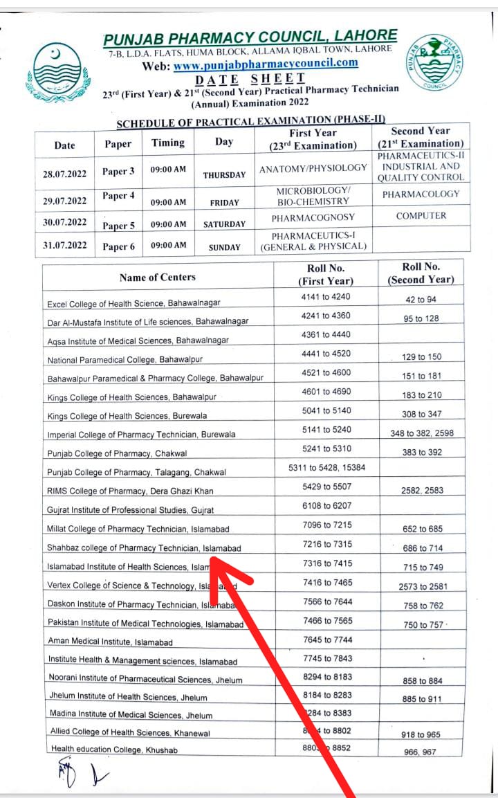 DATE SHEET 23rd (First Year) & 21st (Second Year) Practical Pharmacy Technician (Annual) Examination 2022
